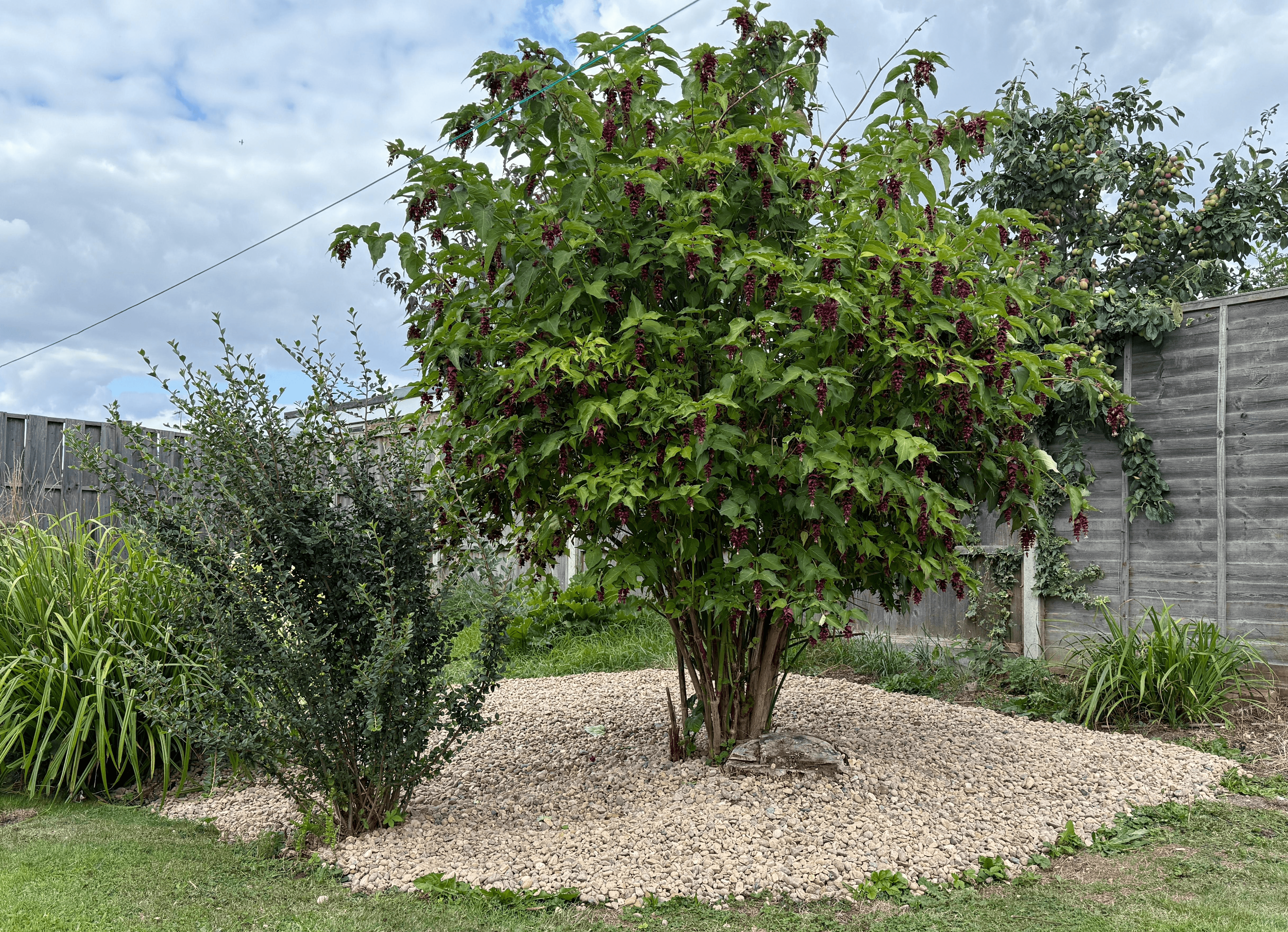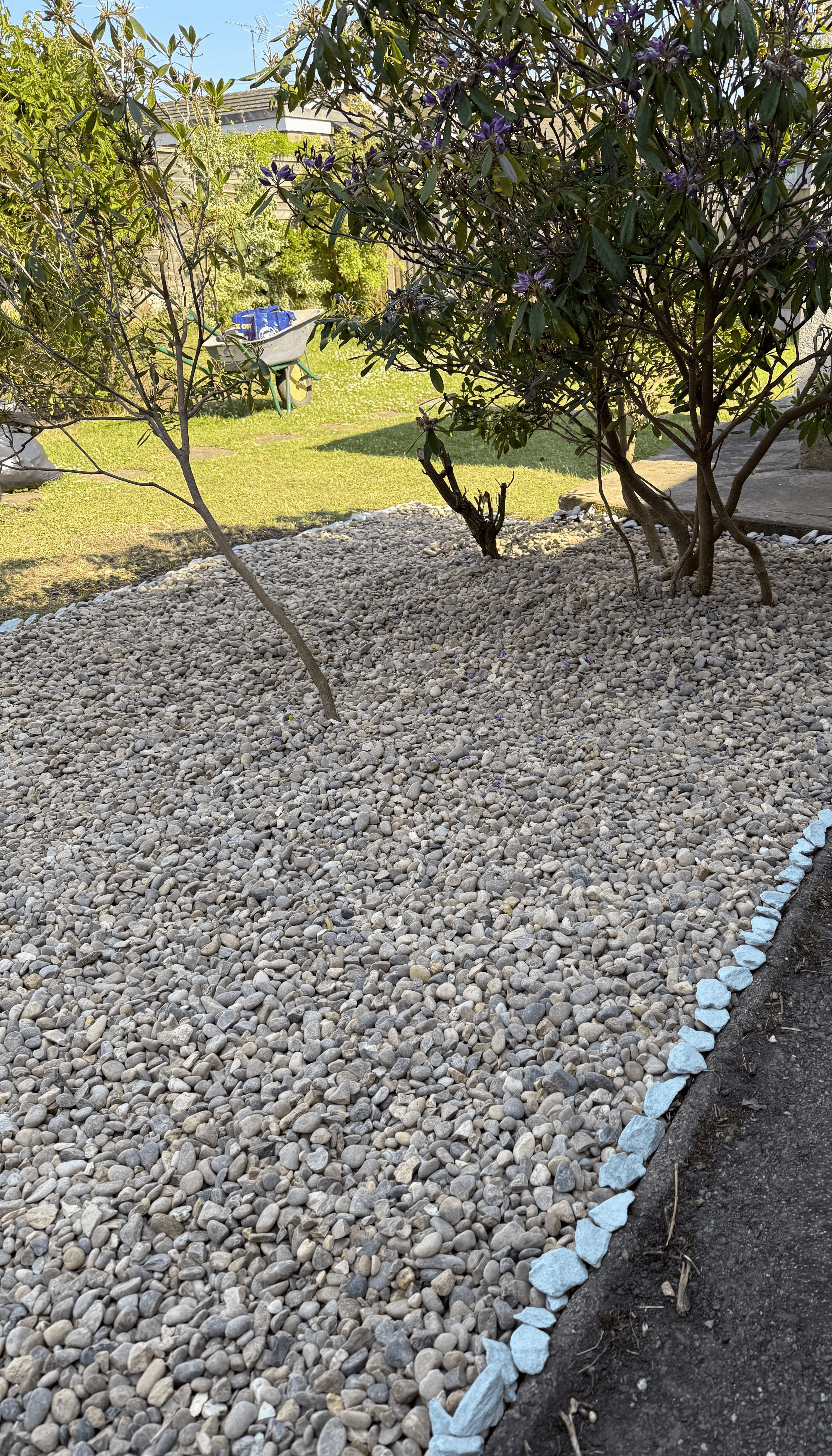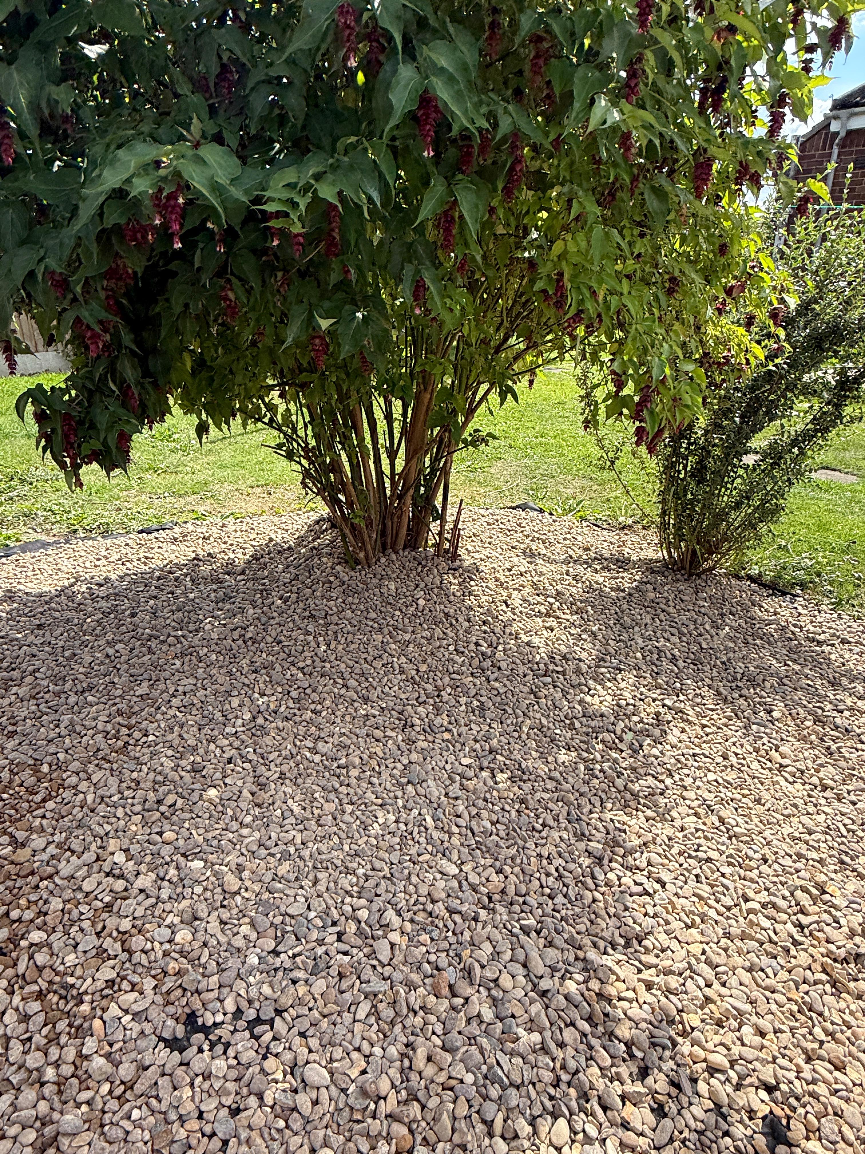 Beneath this vibrant garden tree, tangled weeds and stubborn roots were dug out and cleared completely. Weed membrane was installed and covered with natural shingle to create a tidy, low-maintenance feature that highlights the tree as a central focal point in the garden.